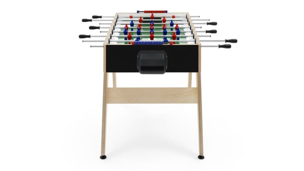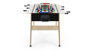 De voetbaltafel is vervaardigd uit een stevige multiplex speelkast met een duurzame, weerbestendige afwerking. Het speelveld bestaat uit gehard glas voor een gelijkmatige balrol en optimale duurzaamheid.